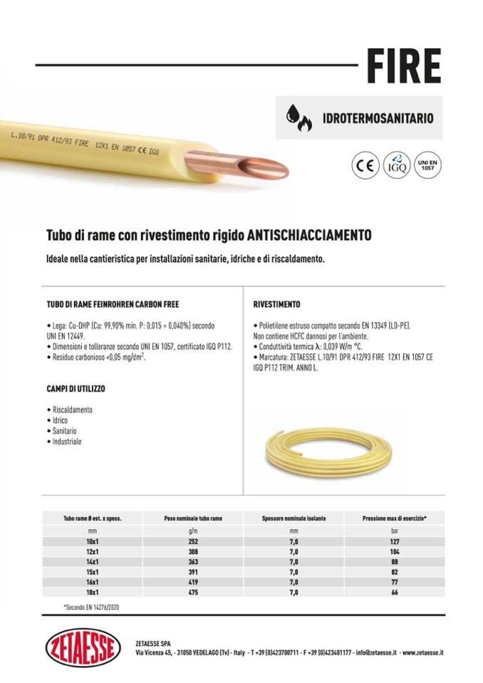 • Marcatura: ZETAESSE L.10/91 DPR 412/93 FIRE 12X1 EN 1057 CE