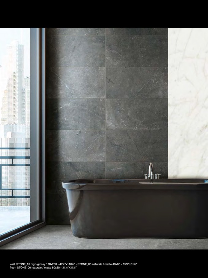 wall: STONE_01 high-glossy 120x280 - 474”x1104” - STONE_06 naturale / matte 40x80 - 15p”x312”