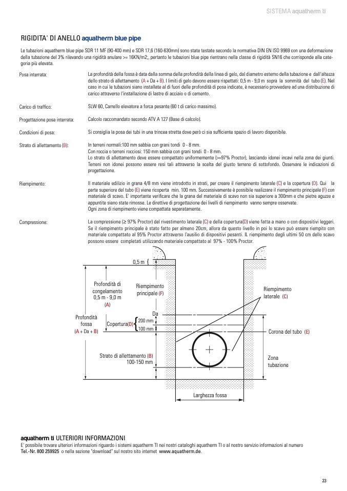 dello strato di allettamento (A + Da + B). I limiti di gelo devono essere rispettati: 0,5 m - 9,0 m sopra la sommità del tubo (E). Nel