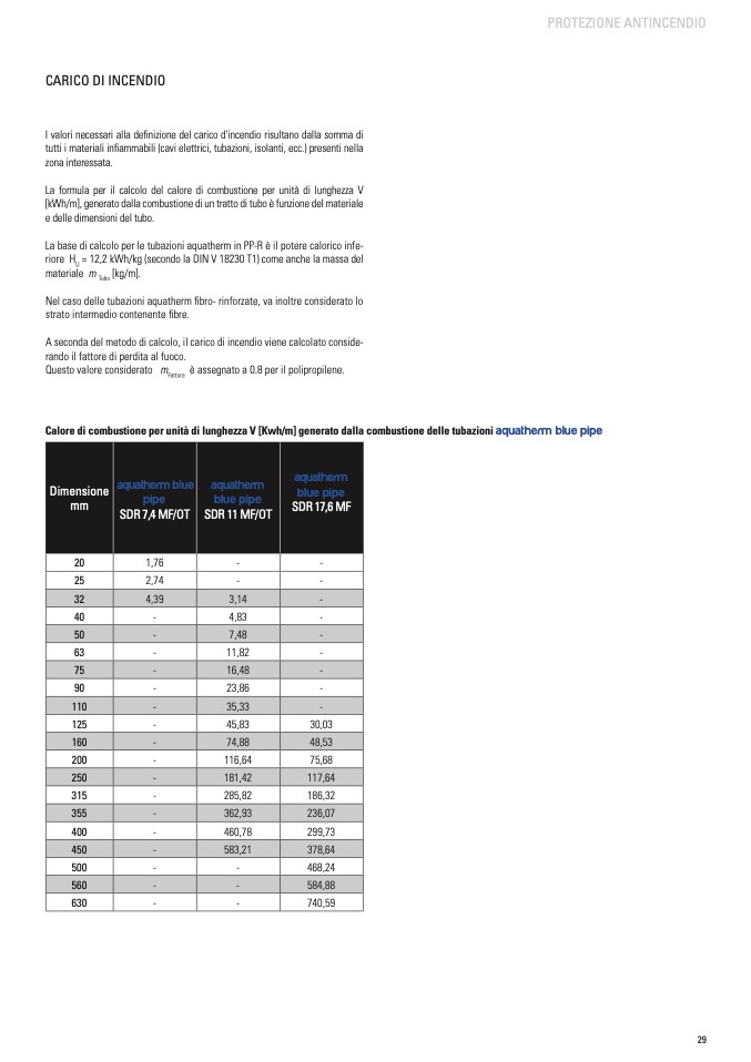 Calore di combustione per unità di lunghezza V [Kwh/m] generato dalla combustione delle tubazioni aquatherm blue pipe