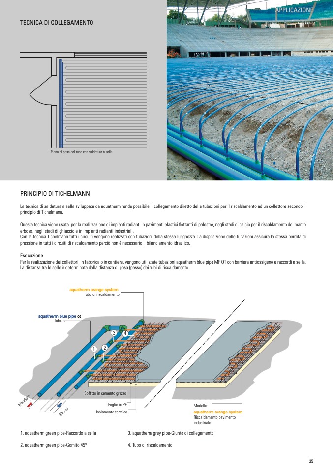 Questa tecnica viene usata per la realizzazione di impianti radianti in pavimenti elastici flottanti di palestre, negli stadi di calcio per il riscaldamento del manto