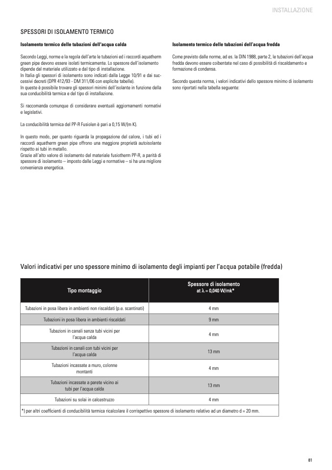 *) per altri coefficienti di conducibilità termica ricalcolare il corrispettivo spessore di isolamento relativo ad un diametro d = 20 mm.