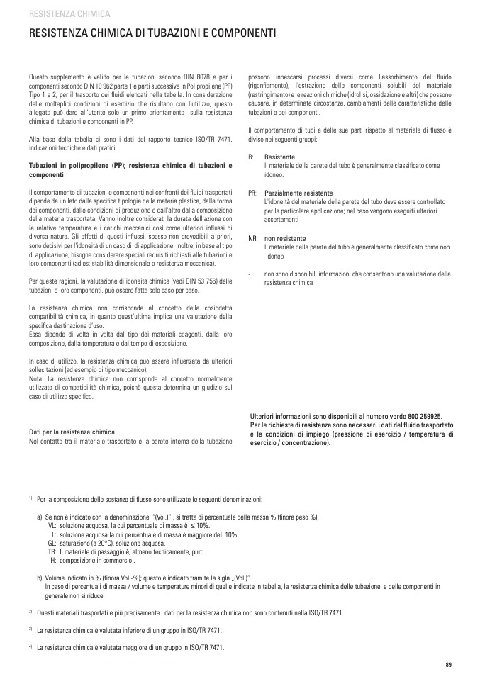 In caso di percentuali di massa / volume e temperature minori di quelle indicate in tabella, la resistenza chimica delle tubazione e delle componenti in