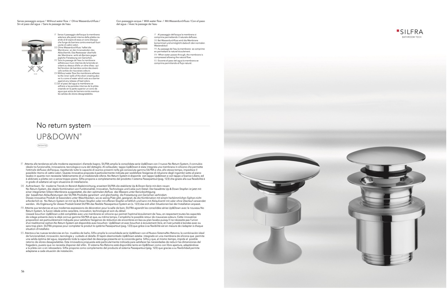 d’un traditionnel siphon.No Return System est disponible avec bouchon Up&Down et avec bouchon à écoulement libre, et il est jumelé à bondes avec ou