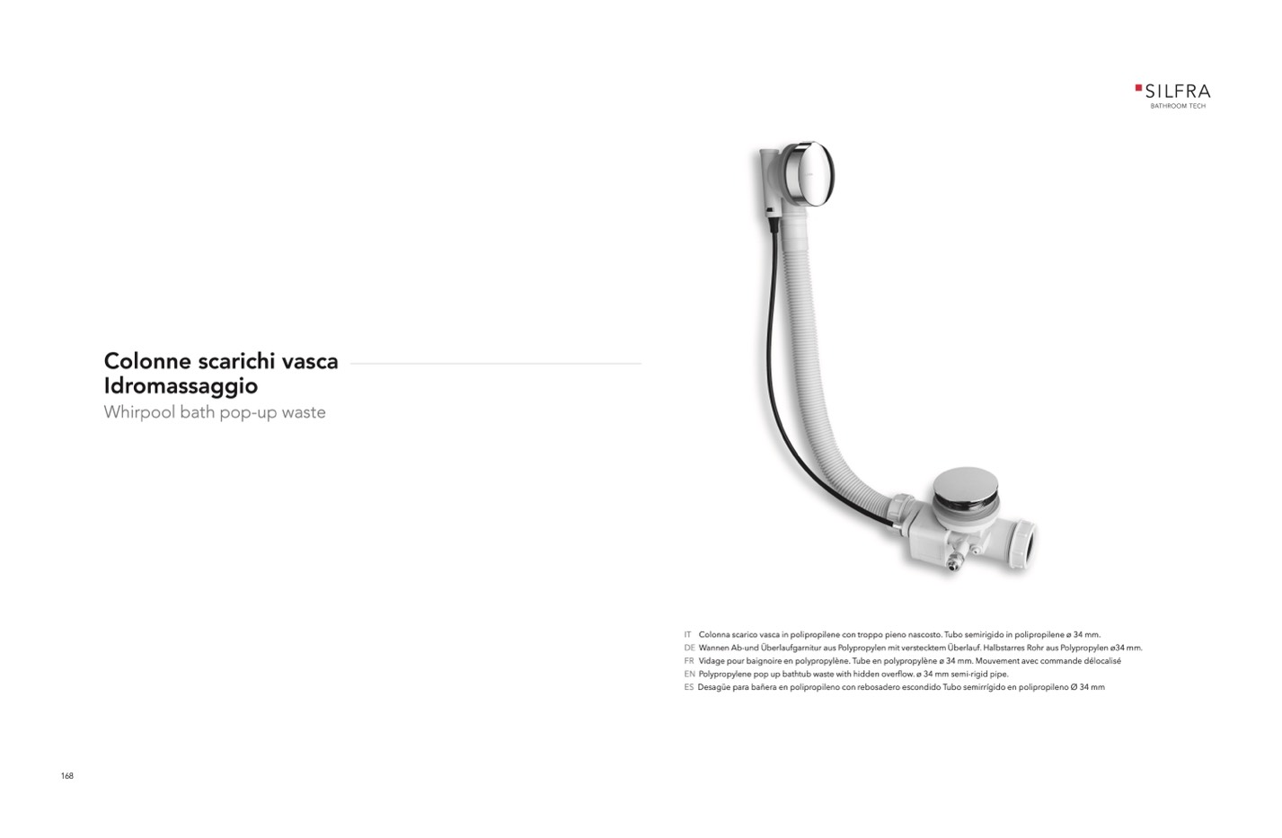 IT Colonna scarico vasca in polipropilene con troppo pieno nascosto. Tubo semirigido in polipropilene ø 34 mm.