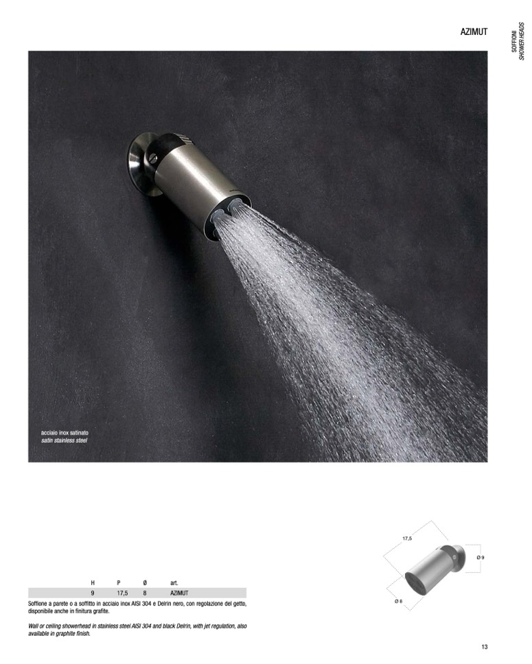 Soffione a parete o a soffitto in acciaio inox AISI 304 e Delrin nero, con regolazione del getto,