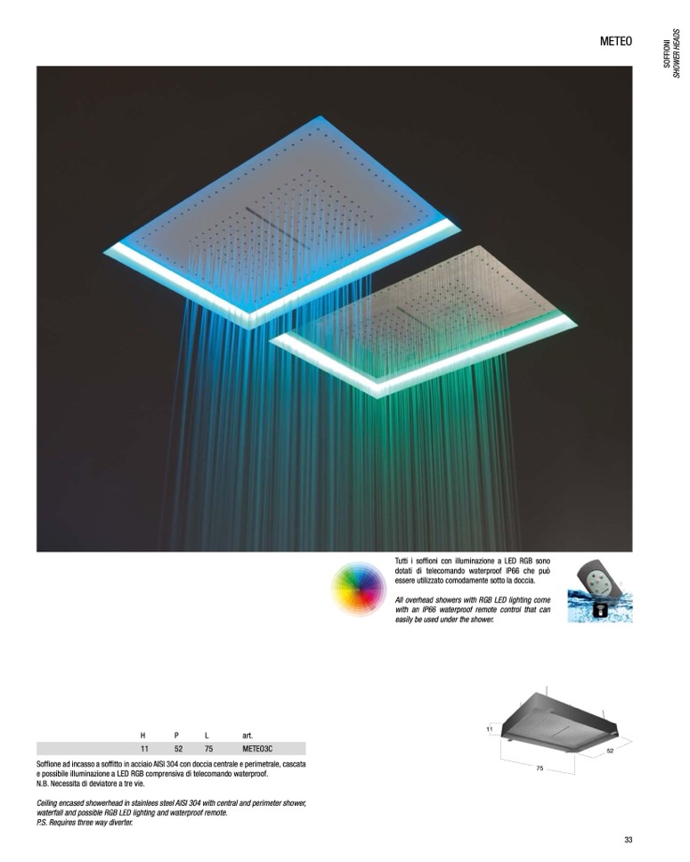 Soffione ad incasso a soffitto in acciaio AISI 304 con doccia centrale e perimetrale, cascata