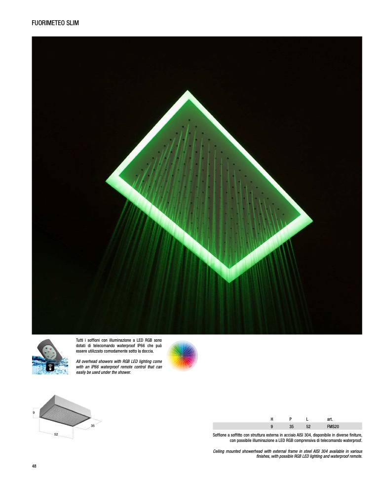 Soffione a soffitto con struttura esterna in acciaio AISI 304, disponibile in diverse finiture,