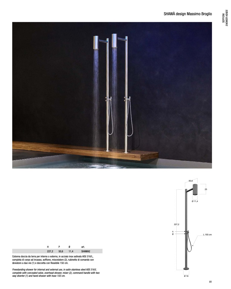 Colonna doccia da terra per interno o esterno, in acciaio inox satinato AISI 316/L,
