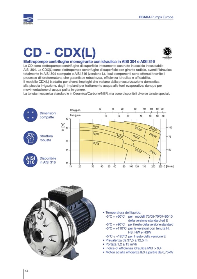 AISI 304. Le CDX(L) sono elettropompe centrifughe di superficie con girante radiale, aventi l’idraulica
