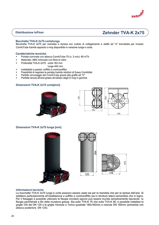 Le bocchette TVA-K 2x75 lunga e corta possono essere usate sia per la mandata che per la ripresa dell’aria. Si
