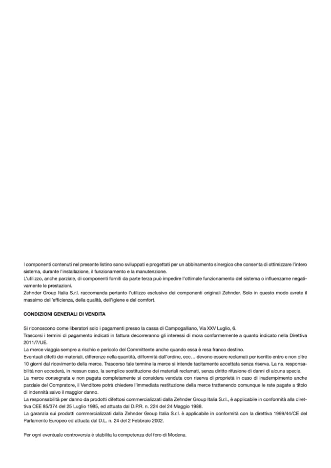 La garanzia sui prodotti commercializzati dalla Zehnder Group Italia S.r.l. è applicabile in conformità con la direttiva 1999/44/CE del
