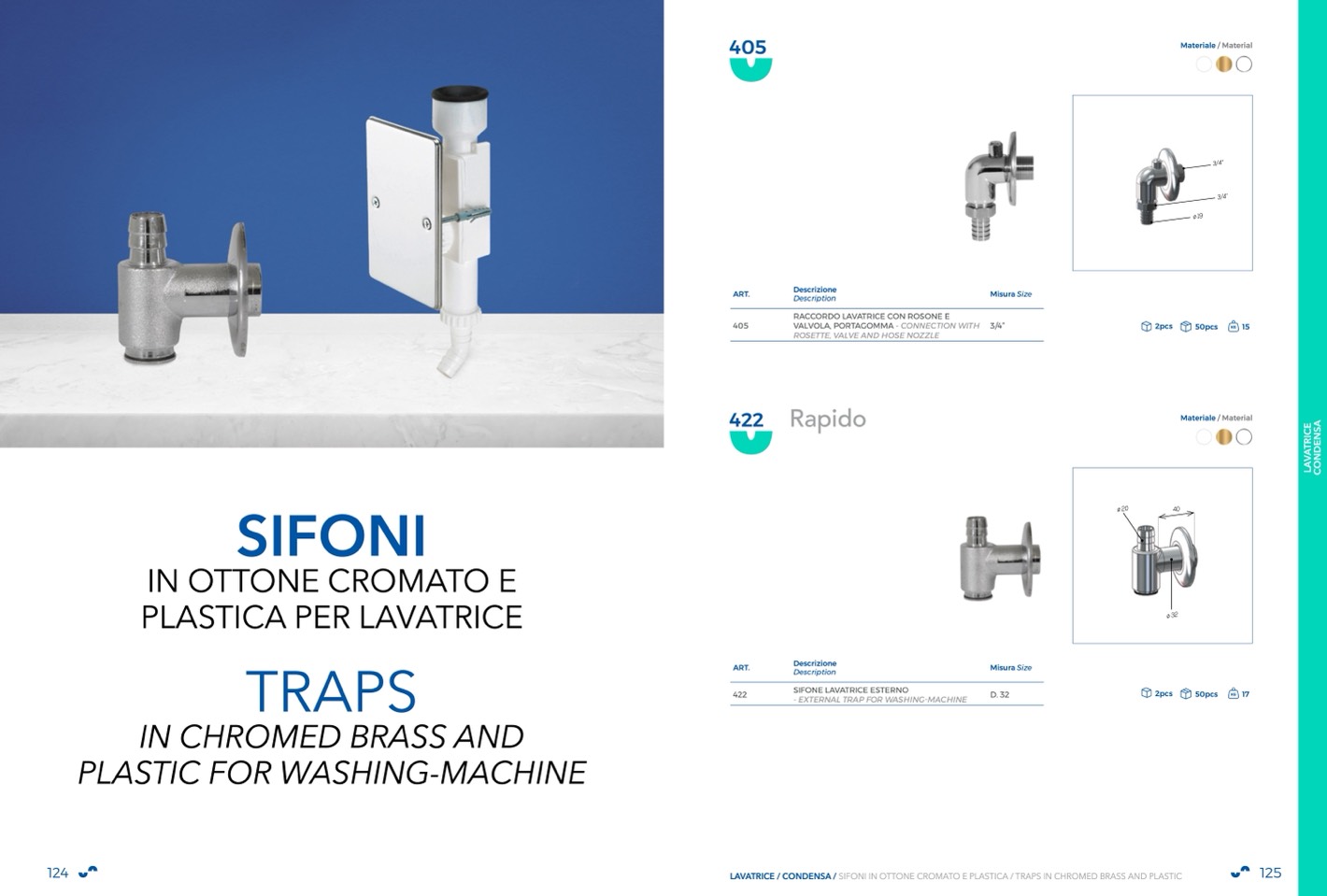 LAVATRICE / CONDENSA / SIFONI IN OTTONE CROMATO E PLASTICA / TRAPS IN CHROMED BRASS AND PLASTIC