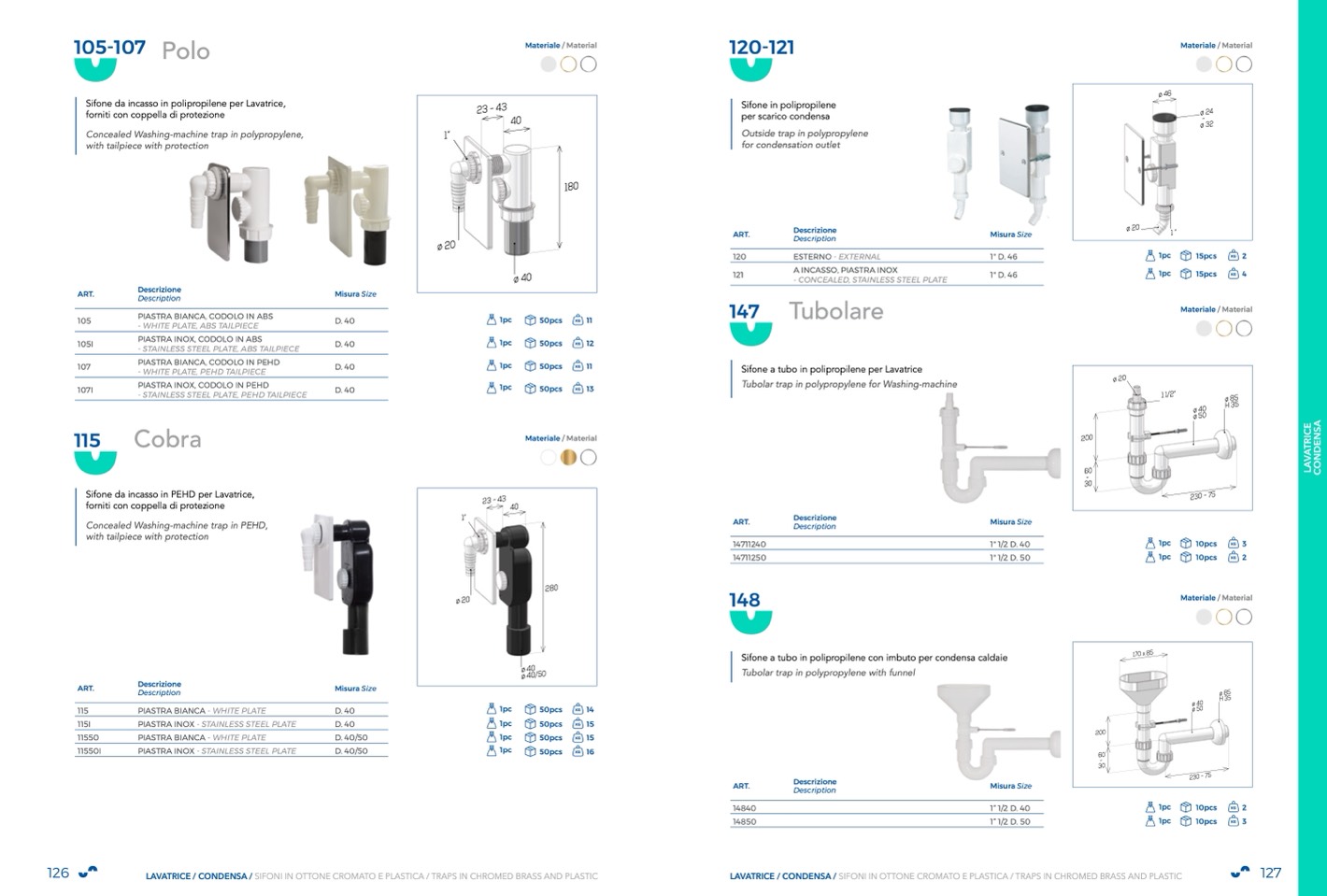LAVATRICE / CONDENSA / SIFONI IN OTTONE CROMATO E PLASTICA / TRAPS IN CHROMED BRASS AND PLASTIC