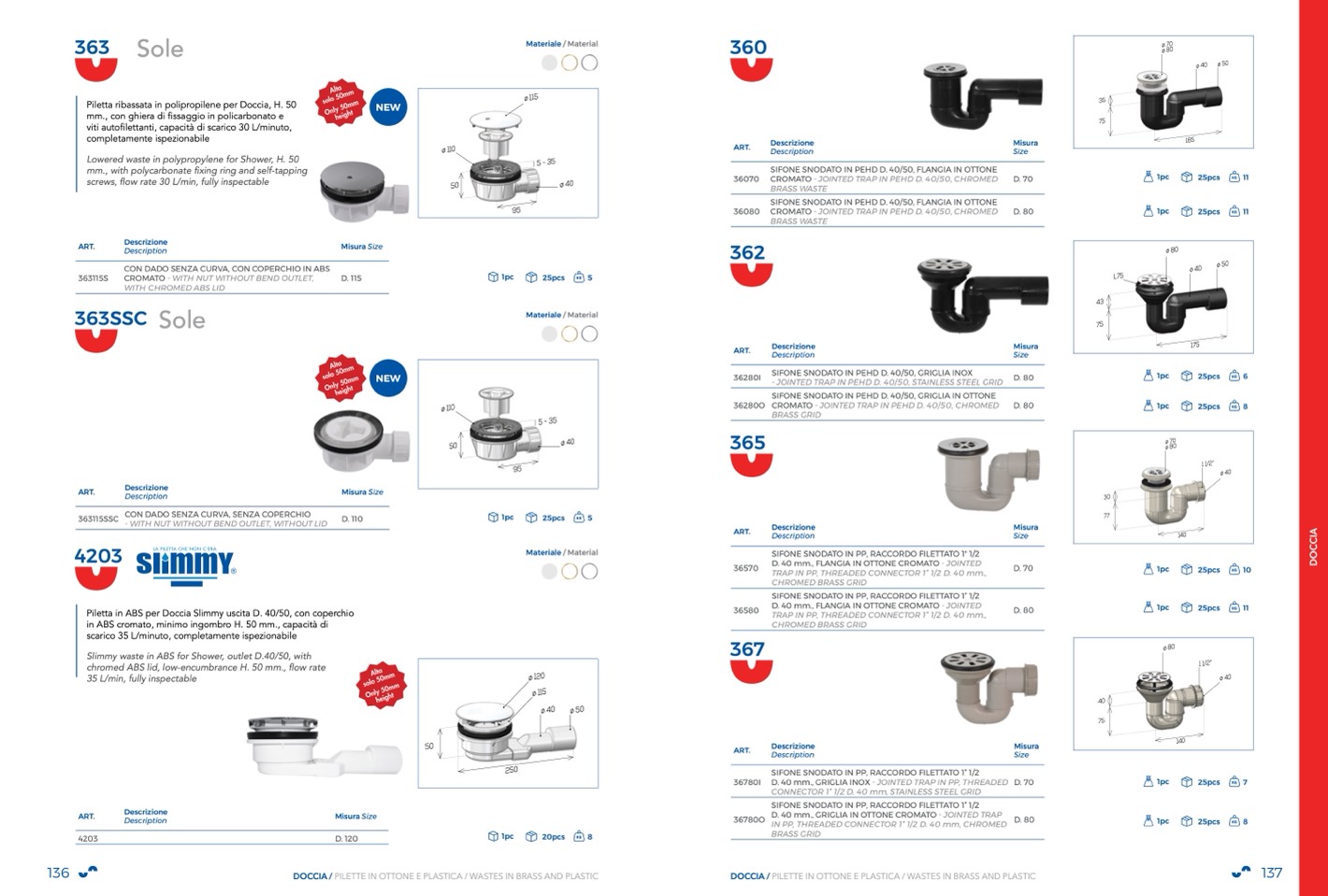 DOCCIA / PILETTE IN OTTONE E PLASTICA / WASTES IN BRASS AND PLASTIC
