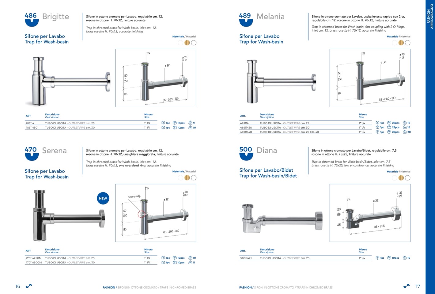 Sifone in ottone cromato per Lavabo, uscita innesto rapido con 2 or,