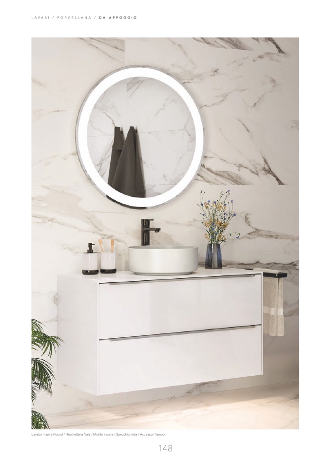 Lavabo Inspira Round / Rubinetteria Naia / Mobile Inspira / Specchio Iridia / Accessori Tempo