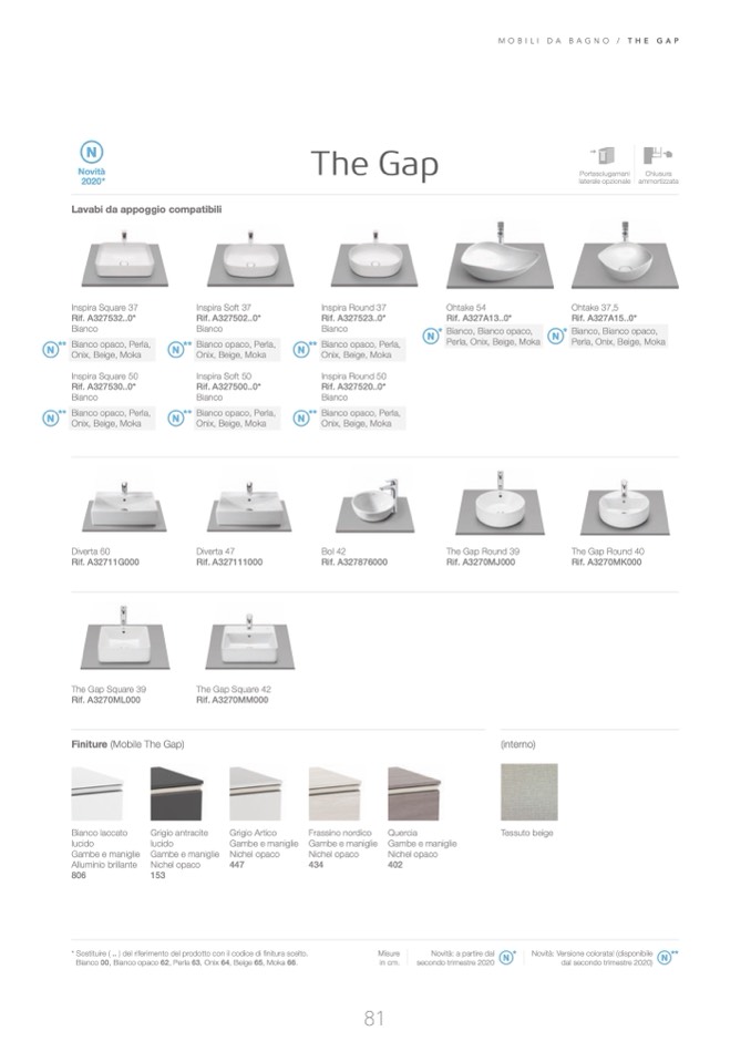Bianco 00, Bianco opaco 62, Perla 63, Onix 64, Beige 65, Moka 66 .