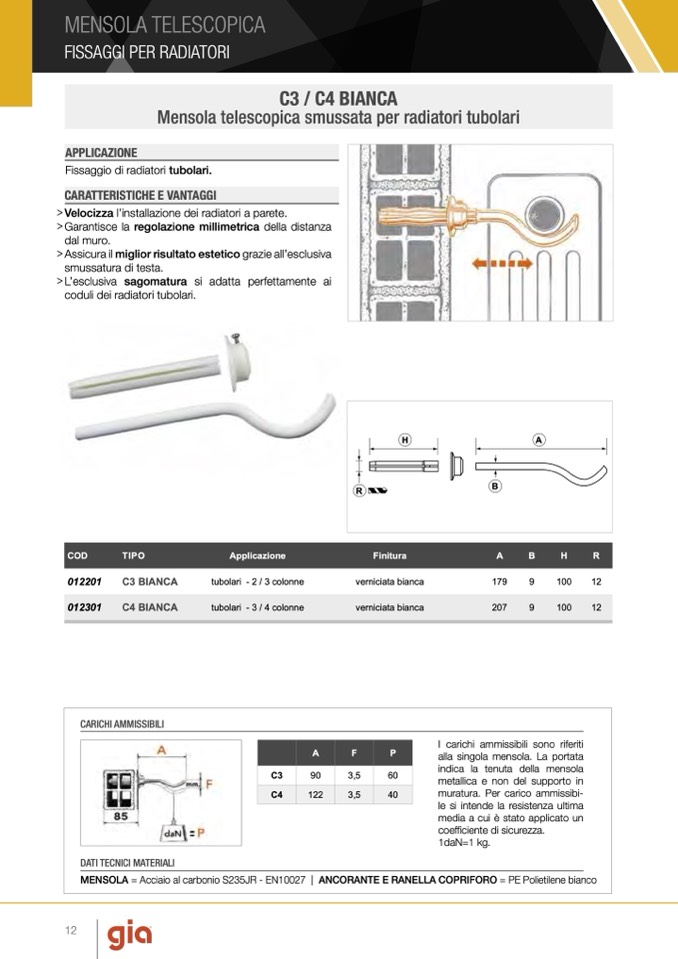 MENSOLA = Acciaio al carbonio S235JR - EN10027 | ANCORANTE E RANELLA COPRIFORO = PE Polietilene bianco