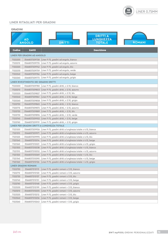 Liner P-75, gradini dritti a lunghezza totale > 4.10, azzurro
