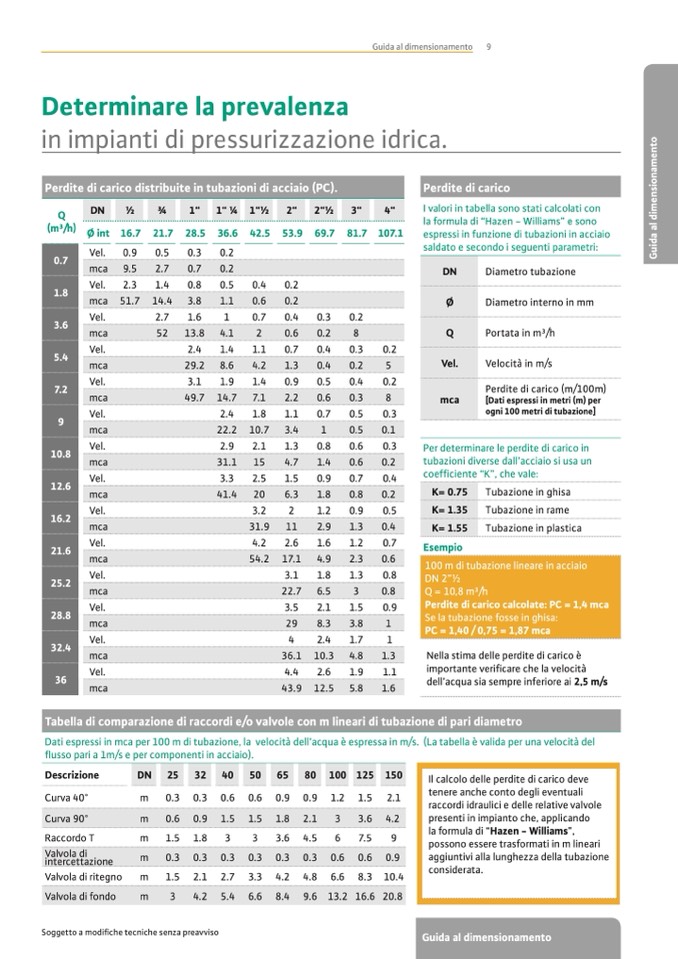 Dati espressi in mca per 100 m di tubazione, la velocità dell’acqua è espressa in m/s. (La tabella è valida per una velocità del