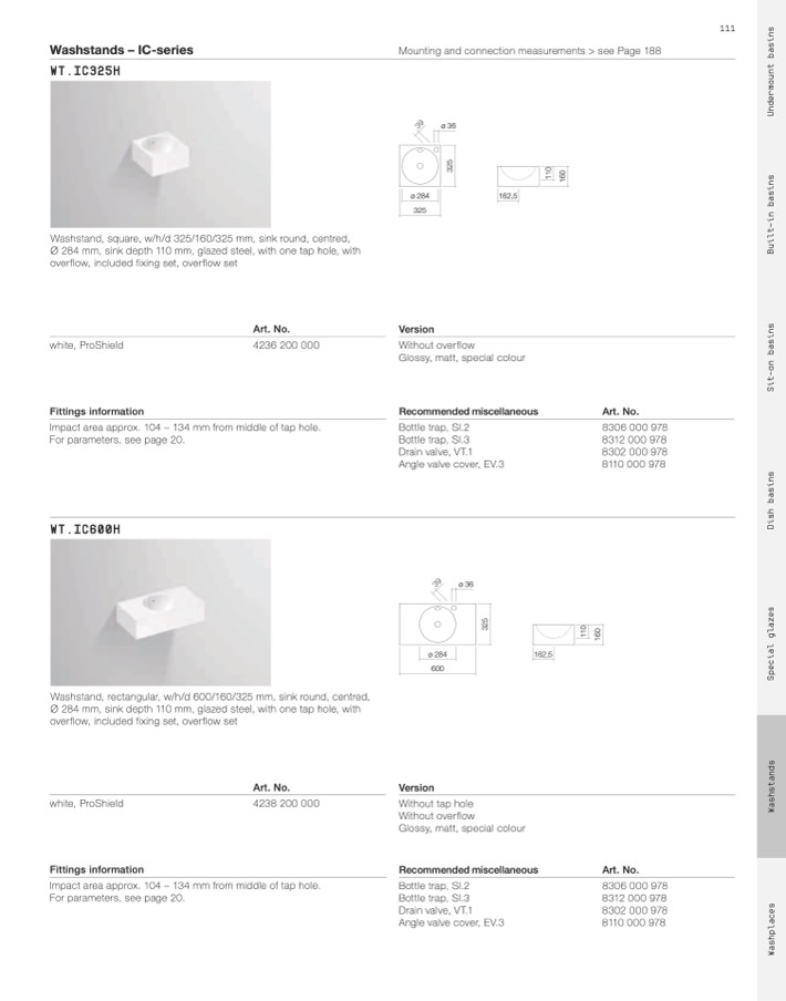 Washstand, rectangular, w/h/d 600/160/325 mm, sink round, centred,