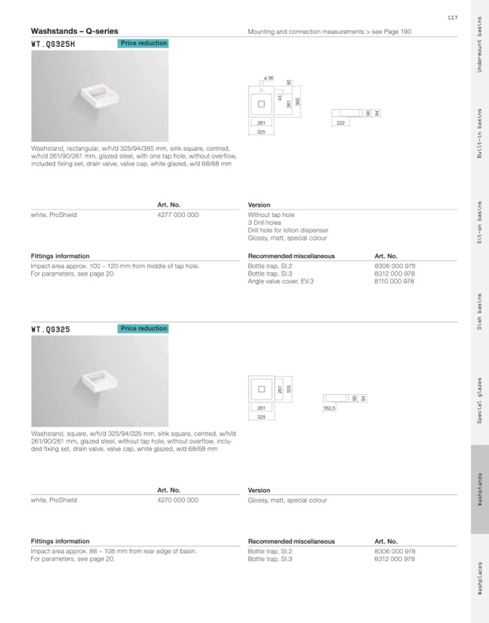 Washstand, rectangular, w/h/d 325/94/385 mm, sink square, centred,