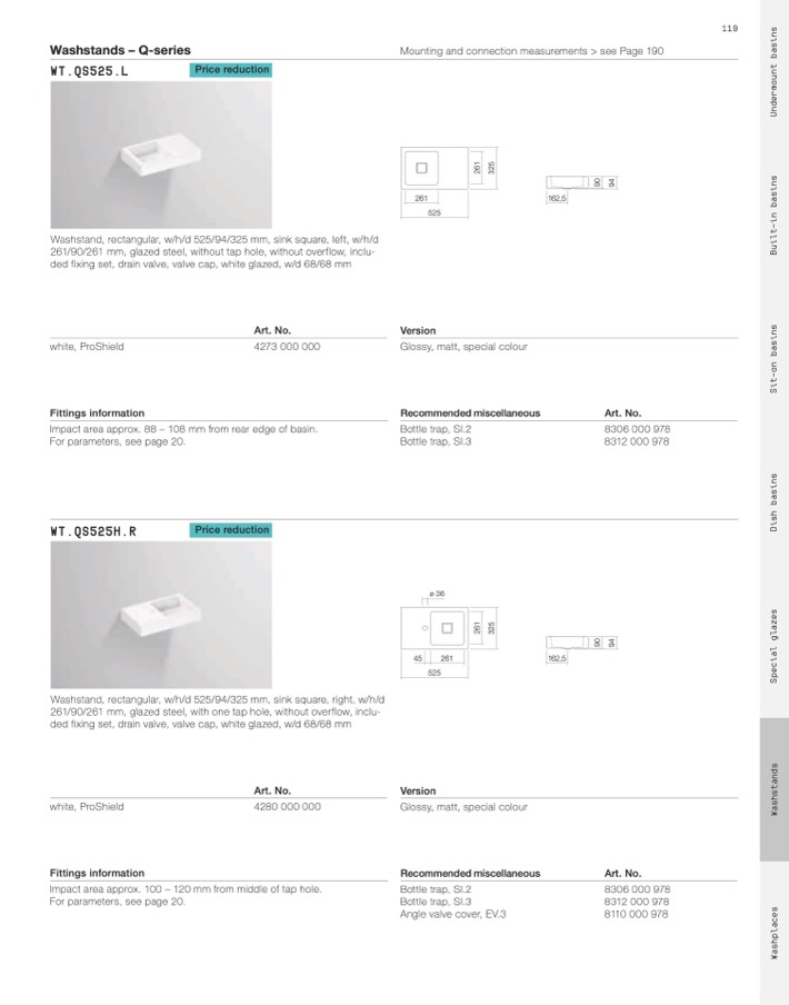 Washstand, rectangular, w/h/d 525/94/325 mm, sink square, right, w/h/d