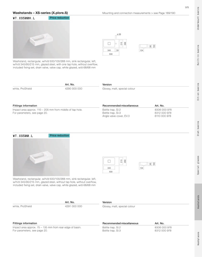 Washstand, rectangular, w/h/d 500/100/268 mm, sink rectangular, left,
