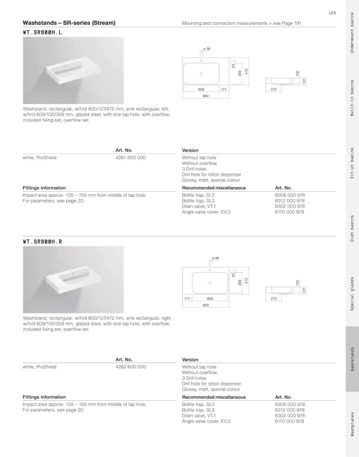 Washstand, rectangular, w/h/d 800/127/472 mm, sink rectangular, right,