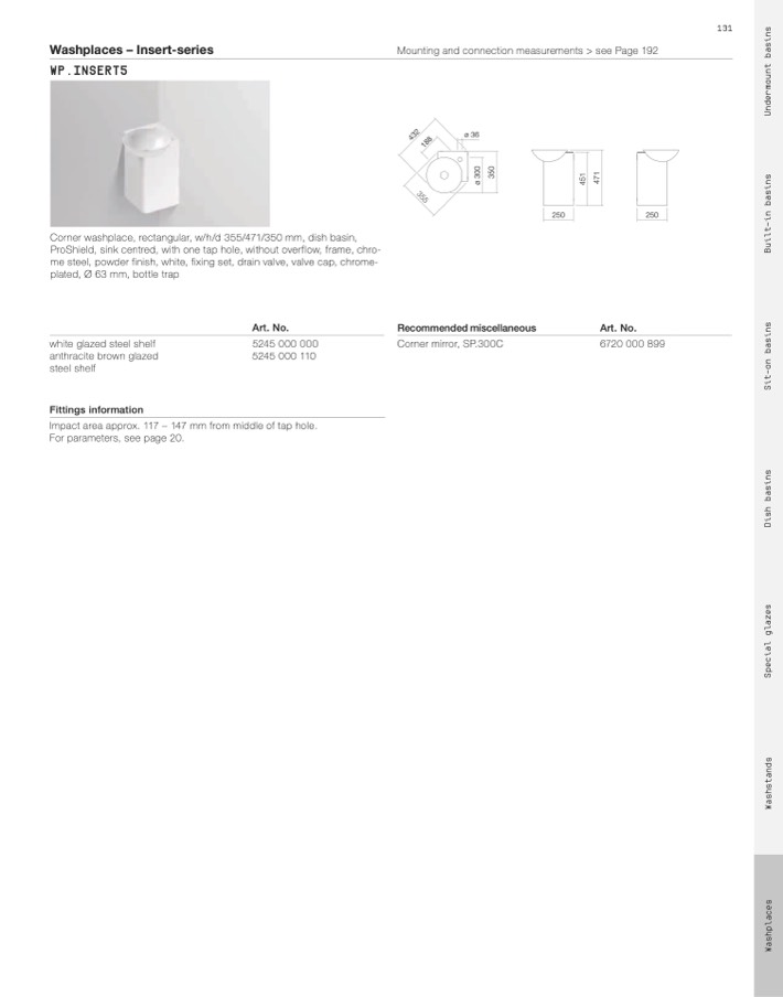 Corner washplace, rectangular, w/h/d 355/471/350 mm, dish basin,