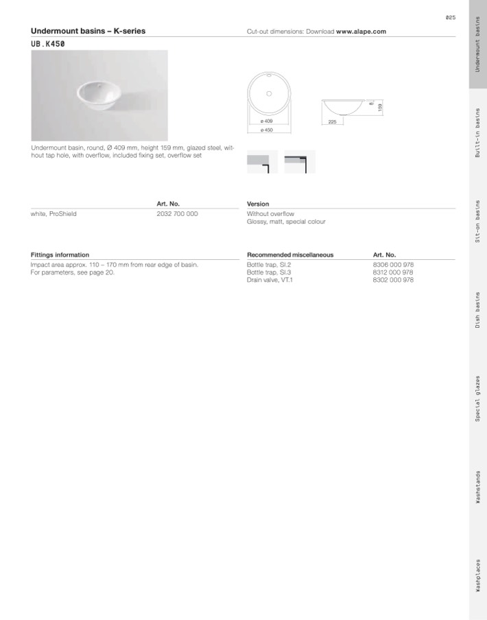 Undermount basin, round, Ø 409 mm, height 159 mm, glazed steel, wit-