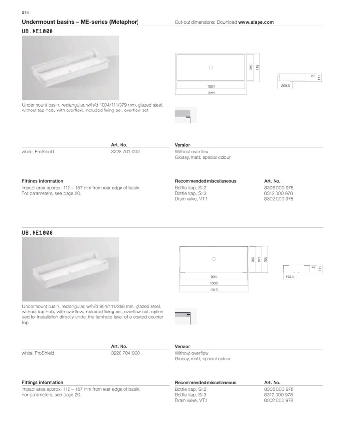 Undermount basin, rectangular, w/h/d 994/111/369 mm, glazed steel,
