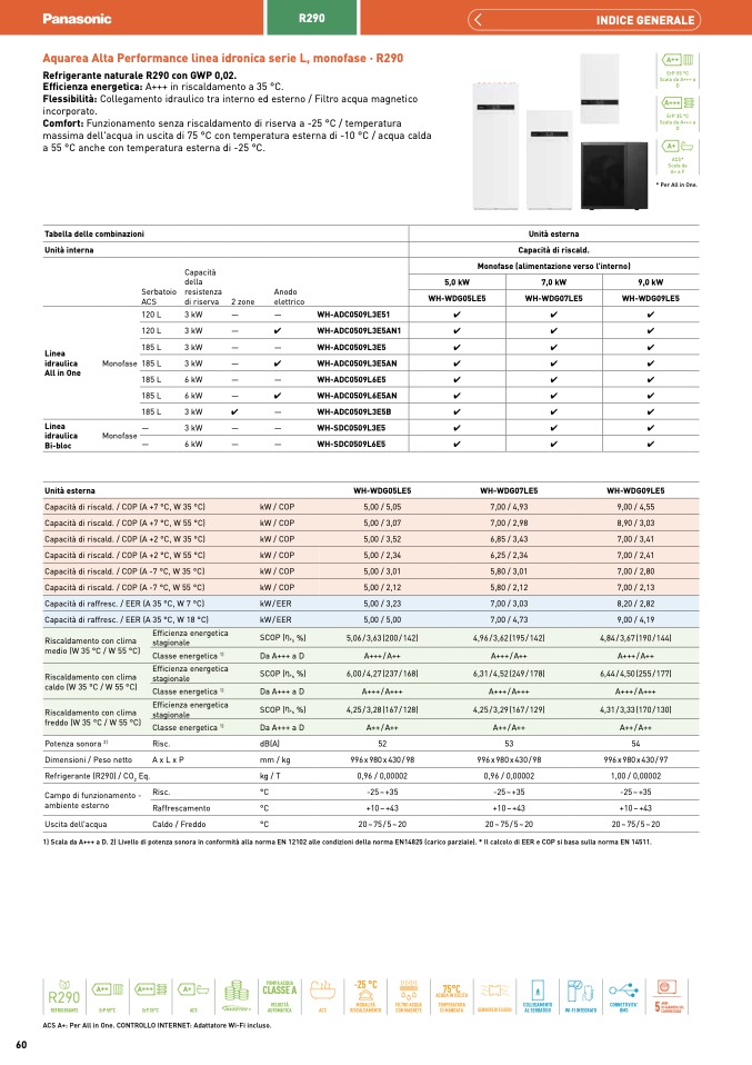 1) Scala da A+++ a D. 2) Livello di potenza sonora in conformità alla norma EN 12102 alle condizioni della norma EN14825 (carico parziale). * Il calcolo di EER e COP si basa sulla norma EN 14511