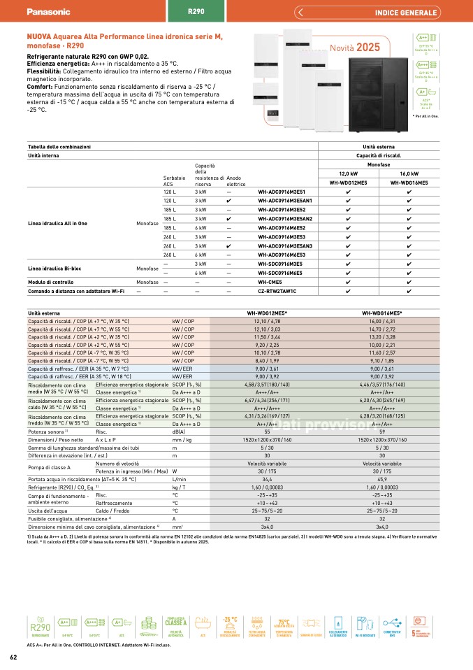 1) Scala da A+++ a D. 2) Livello di potenza sonora in conformità alla norma EN 12102 alle condizioni della norma EN14825 (carico parziale). 3) I modelli WH-WDG sono a tenuta stagna. 4) Verificare le normative