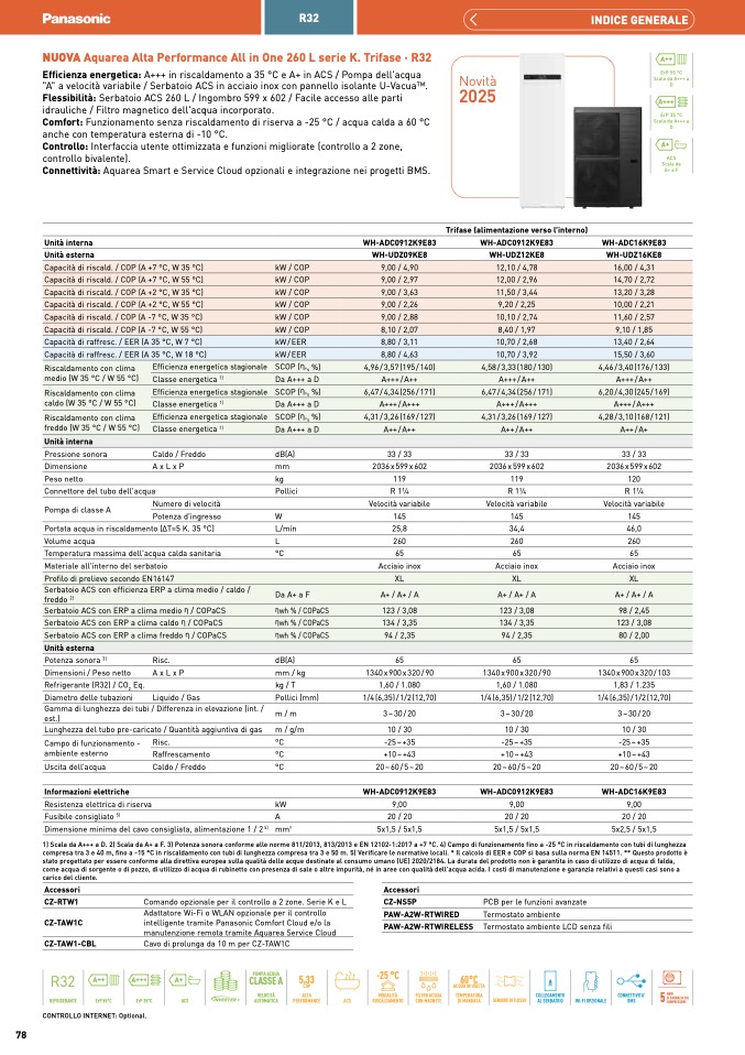 1) Scala da A+++ a D. 2) Scala da A+ a F. 3) Potenza sonora conforme alle norme 811/2013, 813/2013 e EN 12102-1:2017 a +7 °C. 4) Campo di funzionamento fino a -25 °C in riscaldamento con tubi di lunghezza