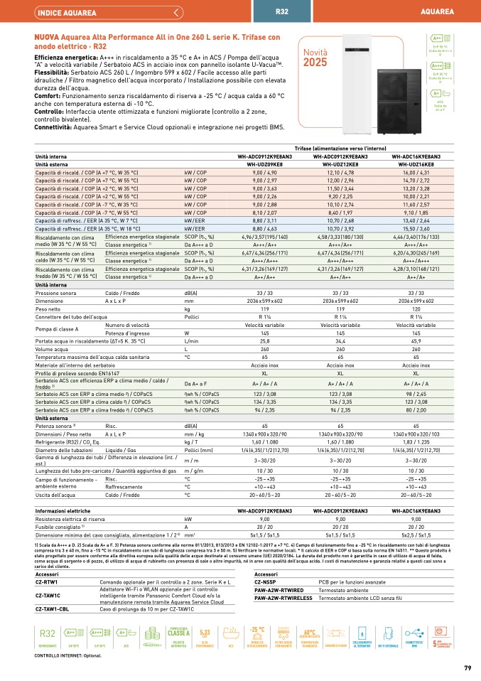 1) Scala da A+++ a D. 2) Scala da A+ a F. 3) Potenza sonora conforme alle norme 811/2013, 813/2013 e EN 12102-1:2017 a +7 °C. 4) Campo di funzionamento fino a -25 °C in riscaldamento con tubi di lunghezza