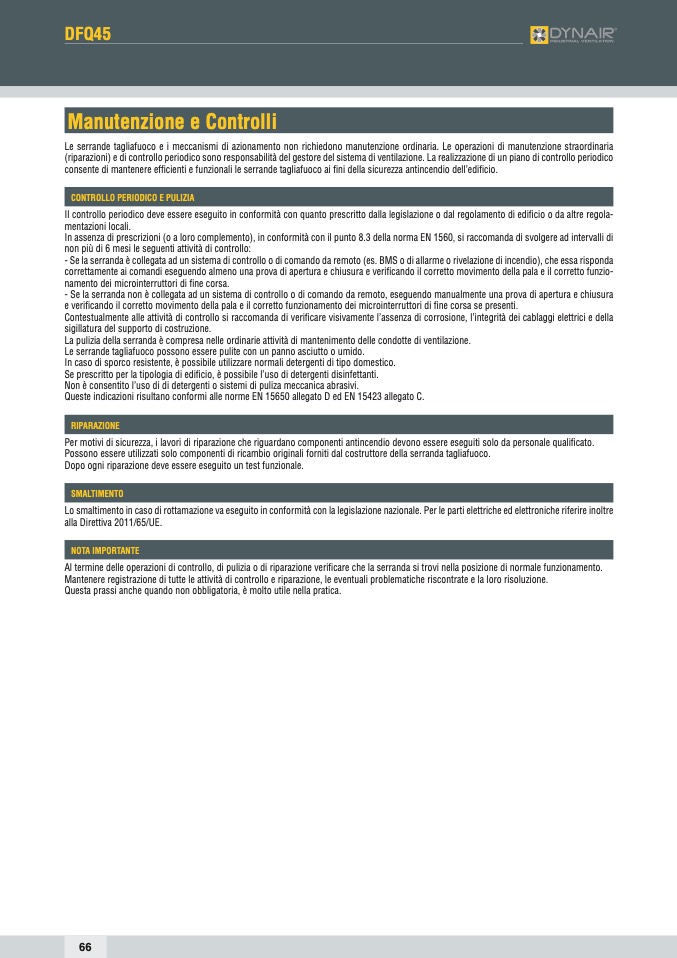 Le serrande tagliafuoco e i meccanismi di azionamento non richiedono manutenzione ordinaria. Le operazioni di manutenzione straordinaria