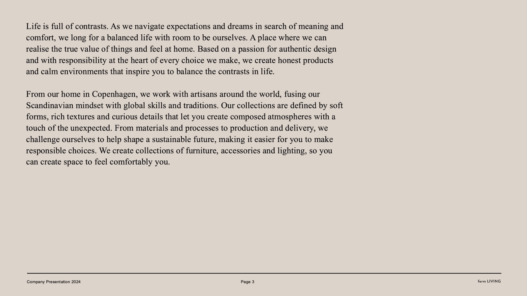 Scandinavian mindset with global skills and traditions. Our collections are defined by soft