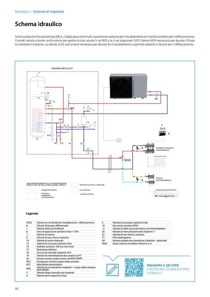 Schema idraulico funzionale tipo EBLA_D abbinata ai terminali in pavimento radiante per il riscaldamento e in ventilconvettori per il raffrescamento.