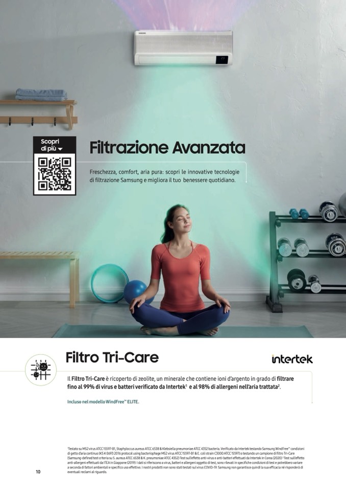 Testato su MS2 virus ATCC 15597-B1, Staphyloccus aureus ATCC 6538 & Klebsiella pneumoniae ATCC 4352 bacteria. Verificato da Intertek testando Samsung WindFree