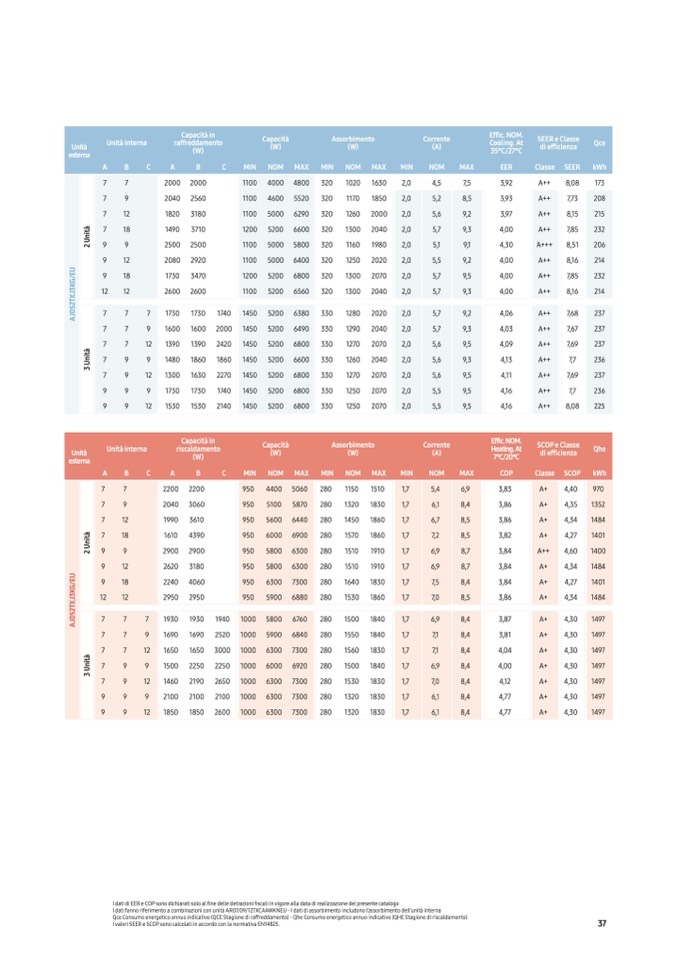 I dati di EER e COP sono dichiarati solo al fine delle detrazioni fiscali in vigore alla data di realizzazione del presente catalogo