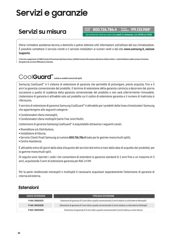 Per la parte residenziale monosplit e multisplit è necessario acquistare separatamente l’estensione di garanzia di