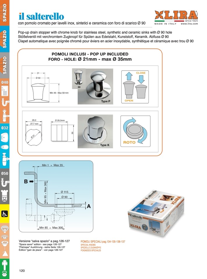 Clapet automatique avec poignée chromé pour éviers en acier inoxydable, synthétique et céramique avec trou Ø 90