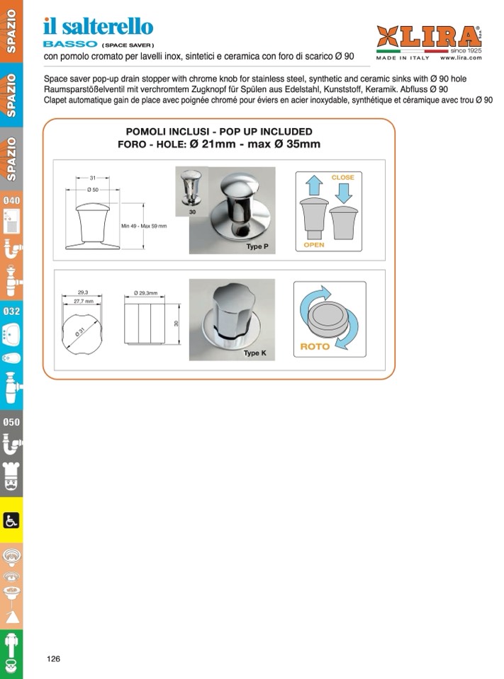 Space saver pop-up drain stopper with chrome knob for stainless steel, synthetic and ceramic sinks with Ø 90 hole