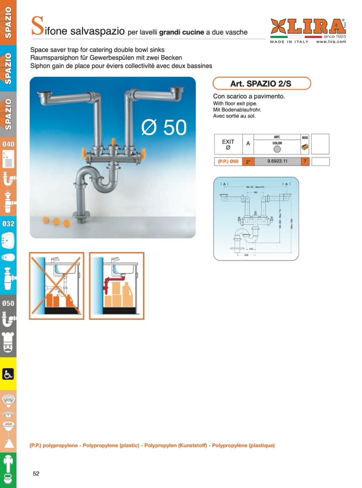 Raumsparsiphon für Gewerbespülen mit zwei Becken