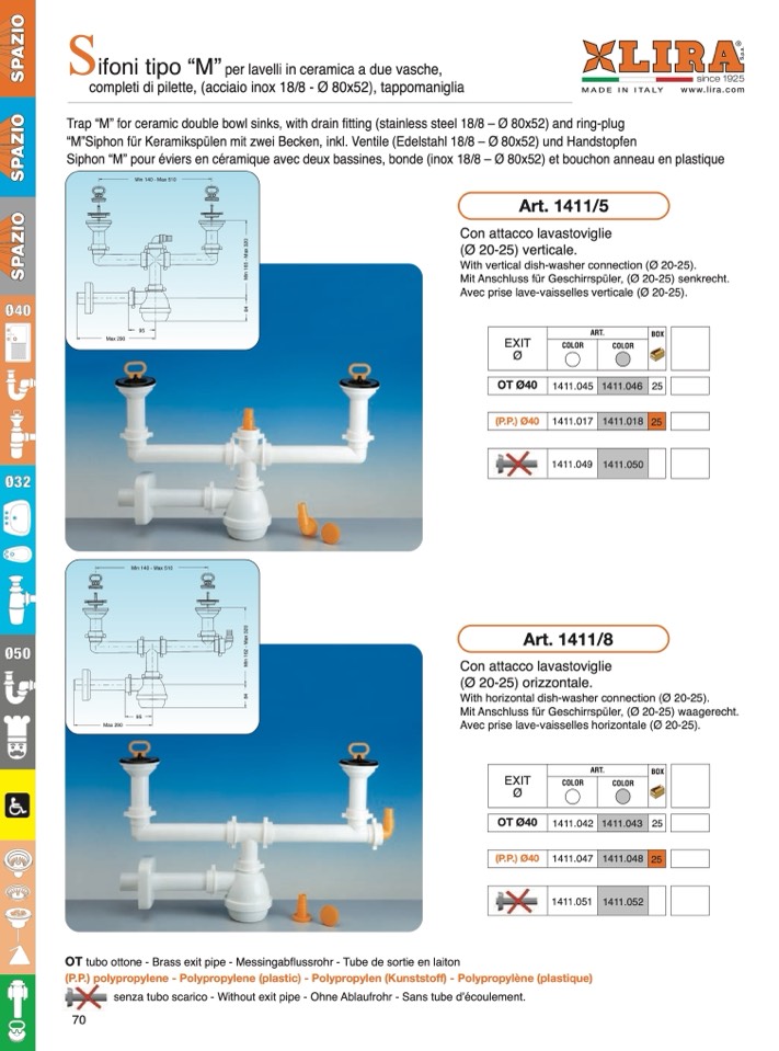 Siphon “M” pour éviers en céramique avec deux bassines, bonde (inox 18/8 – Ø 80x52) et bouchon anneau en plastique