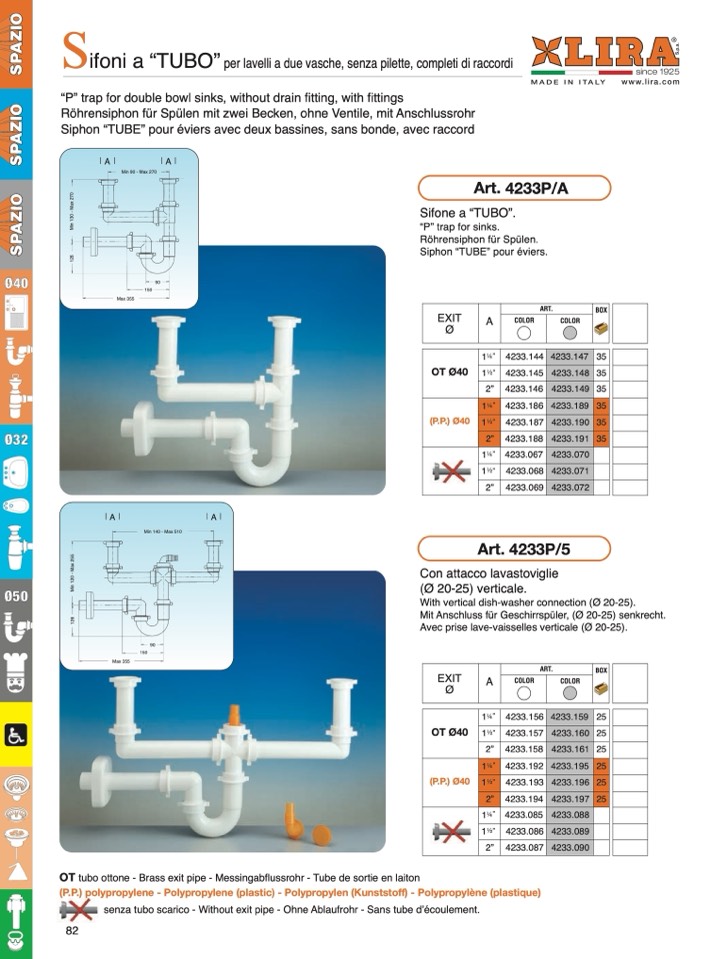Siphon “TUBE” pour éviers avec deux bassines, sans bonde, avec raccord