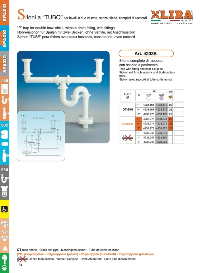 Siphon “TUBE” pour éviers avec deux bassines, sans bonde, avec raccord