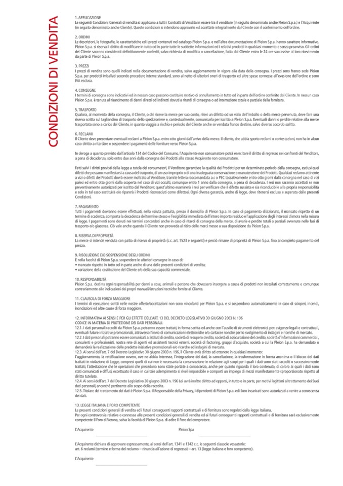 Le seguenti Condizioni Generali di vendita si applicano a tutti i Contratti di Vendita in essere tra il venditore (in seguito denominato anche Pleion S.p.a.) e l’Acquirente